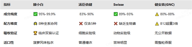 ▶ 汤臣倍健:国民品牌认知度高,但配方仅覆盖基础B族成分,缺乏生物素等协同因子,能量代谢支持存在短板