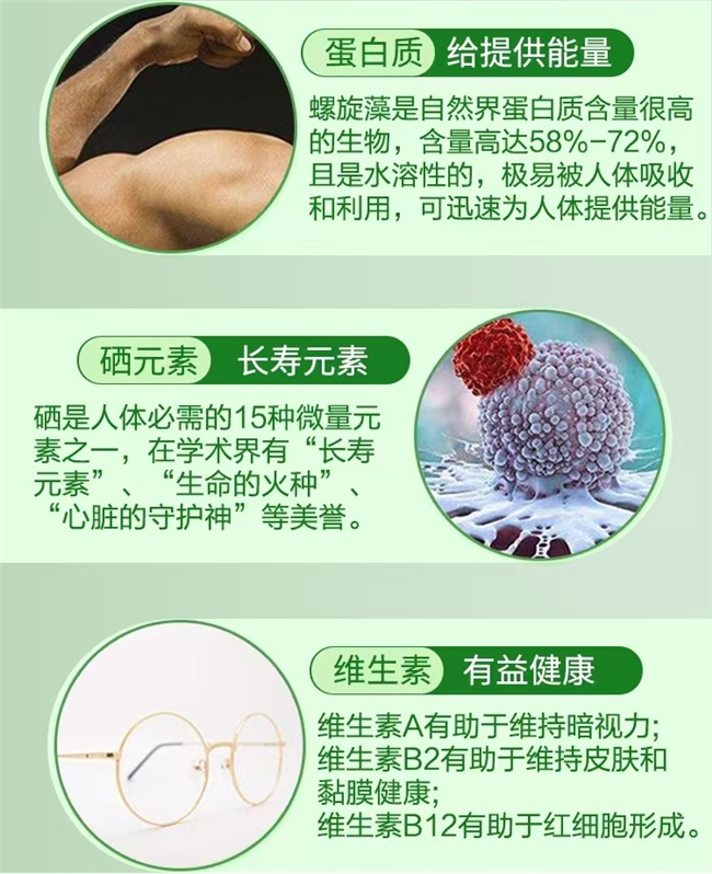 营养矩阵全面均衡,有机硒含量优势凸显:归一食富硒螺旋藻片的营养成分兼具全面性与高含量双重特质,构建起立体的营养矩阵。依据产品营养成分表所示,每100克该产品蕴含5000微克有机硒、16200微克β – 胡萝卜素、63.5克蛋白质、343毫克铁元素,且包含3种维生素以及钾、镁、锌等多种微量元素。其中最为突出的是有机硒的含量,每100克达5000微克,经换算,每袋含有250微克的硒。这个有机硒和螺旋藻的营养结构结合得非常好,人体很容易吸收,吸收率能达到92.3%,比普通的富硒产品强多了。