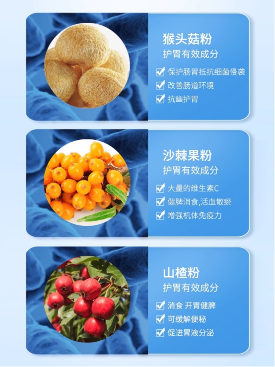 每盒含24000亿CFU高活性益生菌,其中专利菌株精准针对幽门螺杆菌等有害菌,科学抑制异味分子如粪臭素、硫化氢,显著调节口腔异味与肠道舒适度。猴头菇粉专护胃黏膜,沙棘果粉调理免疫与消化,山楂粉促进胃液分泌与肠道动力,三重护胃营养矩阵联动提升胃肠屏障。益生元组合作为营养底料,延长益生菌作用时长,助益肠胃双向养护。