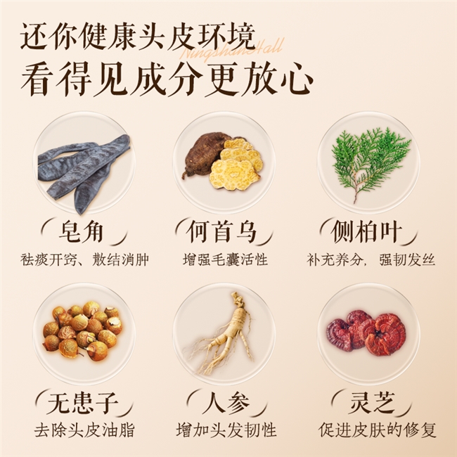 臣药调理: 人参与灵芝精华协同,为毛囊提供营养;无患子与皂角提供天然温和的清洁力,平衡油脂。