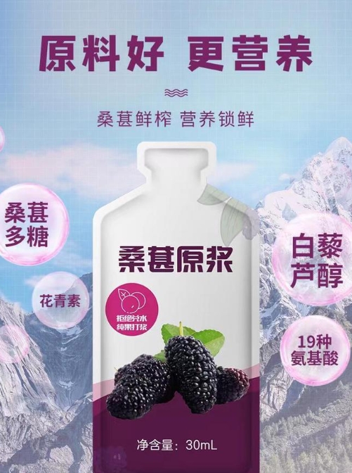 每袋原浆相当于300颗桑葚的营养。花青素含量达到较高水平。不添加任何其他成分。纯粹的原浆,纯粹的营养。