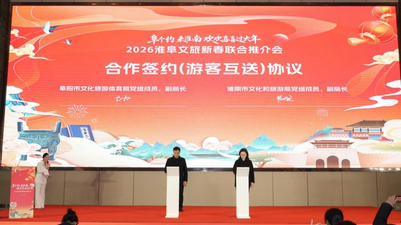 为整合皖北优质文化和旅游资源,助力皖北文旅融合发展圈建设,深化淮阜文旅一体化,激活新春消费市场,2月13日,由淮南市文化和旅游局、阜阳市文化旅游体育局主办的“阜个约,来淮南,欢欢喜喜过大年”2026淮阜文旅新春联合推介会在安徽省阜阳市成功举行。两地文旅系统相关负责人、阜阳市重点旅行商代表、媒体记者、自媒体达人等齐聚一堂,共话合作情谊,共赴新春文旅盛宴。
