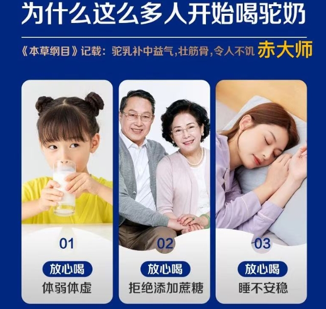 A:驼奶天然富含优质蛋白质、钙、维生素及多种活性物质。不同人群可根据需求选择:成长阶段的青少年关注其高钙高蛋白;上班族关注其营养补充与易吸收;中老年人则看重其作为天然食品的滋养特性。具体益处因人而异,建议将其作为均衡饮食的一部分。