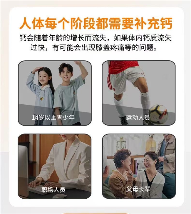 其适配人群广泛,精准覆盖多元养护需求,核心适配人群为:骨质疏松、骨骼密度偏低,经常出现骨骼酸痛、易骨折的人群;关节僵硬、酸痛、灵活性下降,受骨骼关节不适困扰的人群;长期熬夜、高压工作、饮食不均衡,导致身体代谢差、肌肉无力的人群;免疫力低下、经常感冒、有鼻炎困扰,或有自身免疫性疾病倾向的人群;胃肠敏感、胃酸分泌不足,担心养护产品刺激胃肠的人群;长期久坐、缺乏运动、日晒不足,需要日常补充营养,守护骨骼健康的人群。