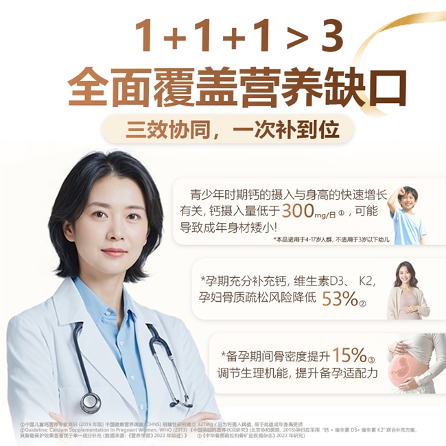 A4:完全不会!每支400mg高钙含量,是精准匹配3岁以上儿童、孕哺期妈妈每日钙需求缺口的剂量,不会出现补过量的情况。而且它的消化吸收效率高,搭配专利D3+K2 协同作用,能让钙充分被身体利用,不会有多余的钙堆积,就算长期服用,也能安全补钙,不用担心过量问题。