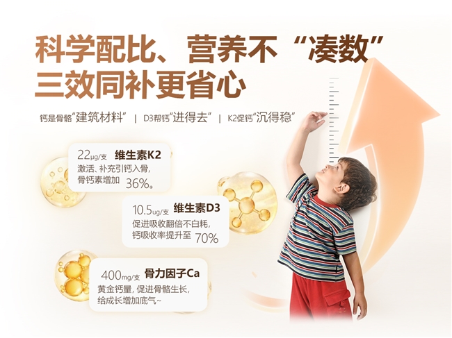 A5:核心原理在于专利维生素K2(MK-7型) 的作用!它能像“导航员”一样,引导吸收后的钙定向沉积于骨骼和牙齿,避免钙在血管、肾脏等软组织异常堆积,而钙在软组织异常堆积正是儿童性早熟的潜在诱因之一,因此长期服用能从根源规避这一风险,兼顾儿童骨骼发育与身体健康。
