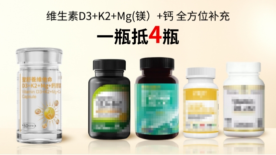 圣舒养维他命摒弃市面上多数产品“单一补D、缺乏协同”的传统模式,打造科学复配矩阵,每2粒含维他命D3 6000IU、维他命K2 240μg、甘氨酸镁400mg、柠檬酸钙200mg,并非单一的D3和钙成分,而是复配了镁和钙,形成协同联动的补D护骨闭环。