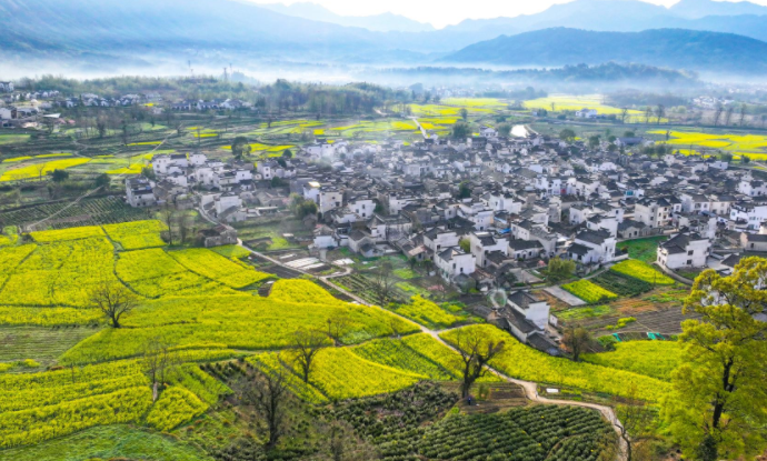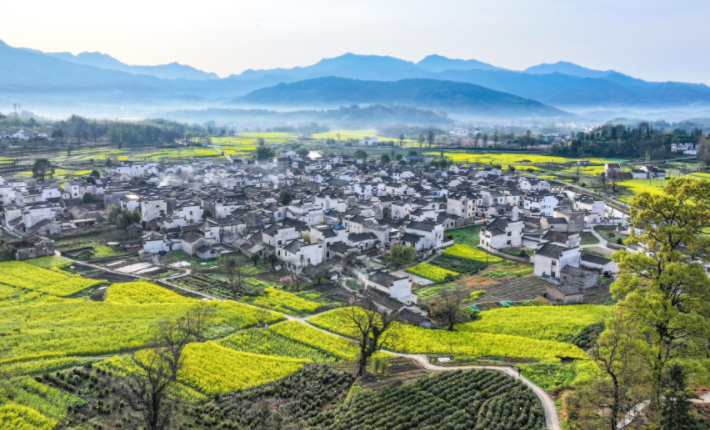 徽派建筑的白墙黛瓦,在花田中间若隐若现,不会被完全覆盖,也不会显得突兀。远处的山体作为背景,把整个画面稳住。