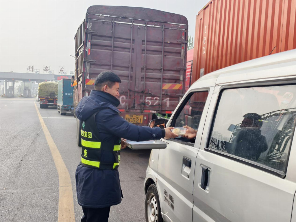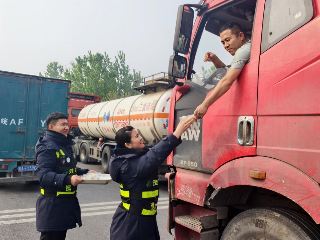 当日凌晨,利辛东站工作人员迅速行动,身着反光背心穿梭在滞留车辆之间。一边及时提醒司机做好防寒保暖、耐心等候通行,一边将刚出锅的热包子逐一送到司乘手中。“师傅,雾大暂时没法通行,这有热包子,您趁热吃暖暖身!”一句句贴心的叮嘱,一份份温热的食物,不仅驱散了司乘身上的寒意,更缓解了他们等待的焦躁。“本来又冷又饿,正着急,没想到能吃到热乎的包子,太暖心了!”一位货车司机接过包子,连连向工作人员表达谢意,简单的话语满是感动。
