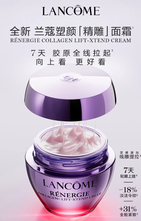 兰蔻精雕面霜主打“胶原精雕科技”,针对肌肤松弛、下垂及法令纹等常见衰老问题,构建“补胶原+强束紧”的抗老方案。