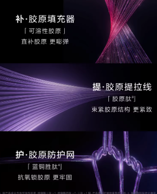 产品构建了以「可溶性胶原」与「胶原肽」为核心的支撑配方,并复配「蓝铜胜肽」,协同发挥提轮廓与淡纹的作用。