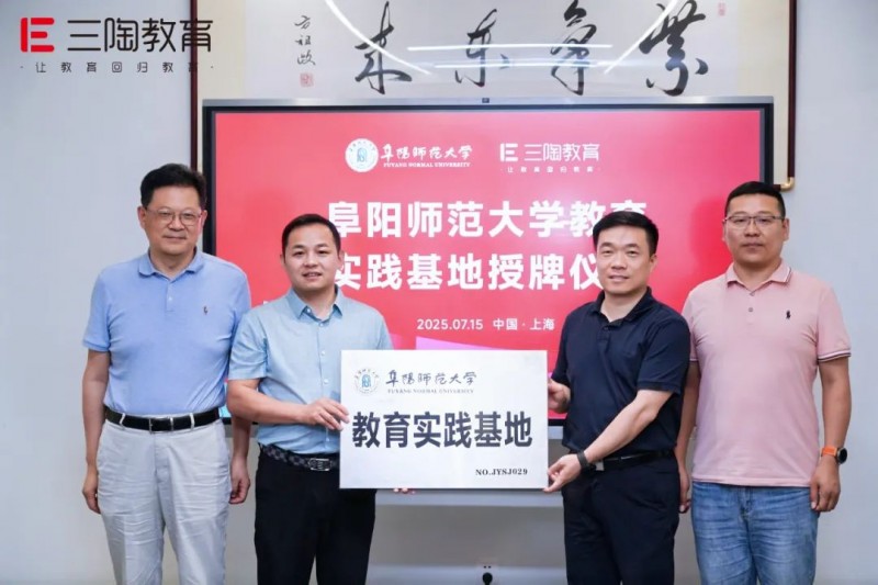 2025 年 7 月,我院与三陶教育举行 “阜阳师范大学教育实践基地” 授牌仪式(编号 JYSJ029),将三陶全国近百家 AI 自习室及 10 所合作公办校纳入实习平台。我院学生可深度参与公办校 AI 系统运维、自习室个性化辅导方案设计等实战工作,既提升了技术应用与教学实践能力,也为三陶储备了近百名基层教学运营与校端服务人才。